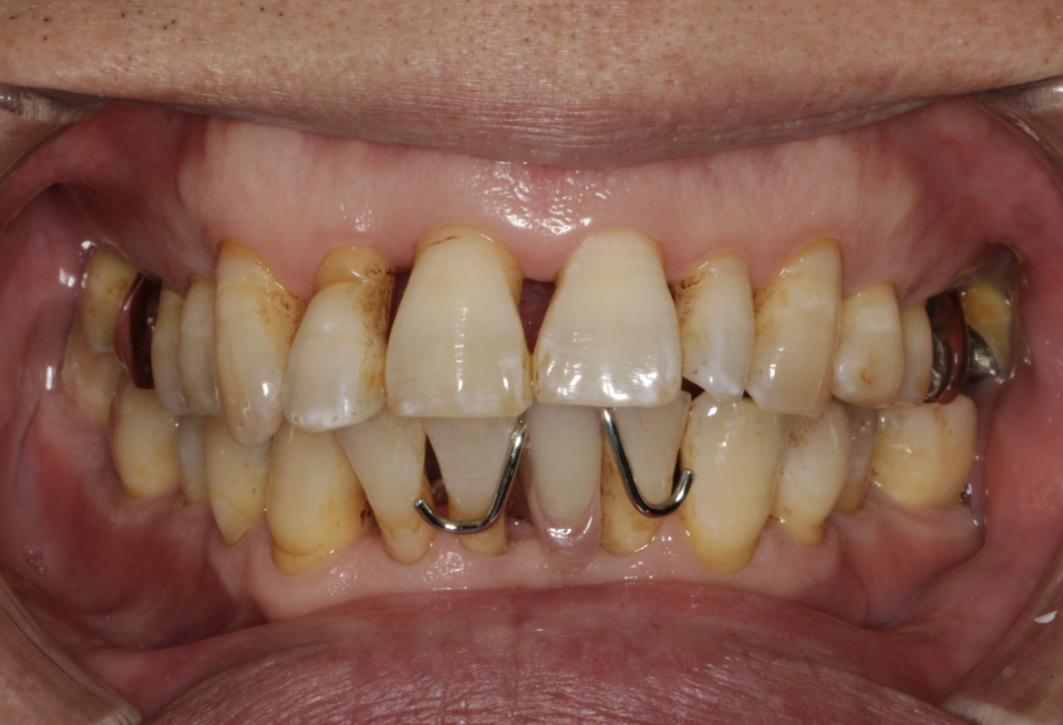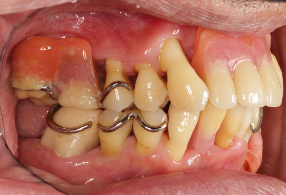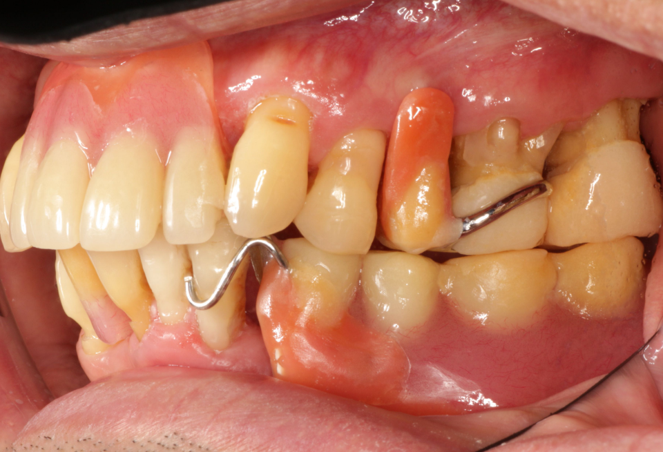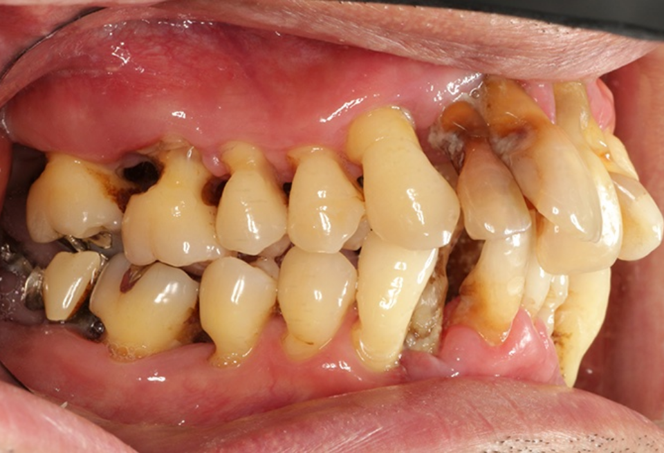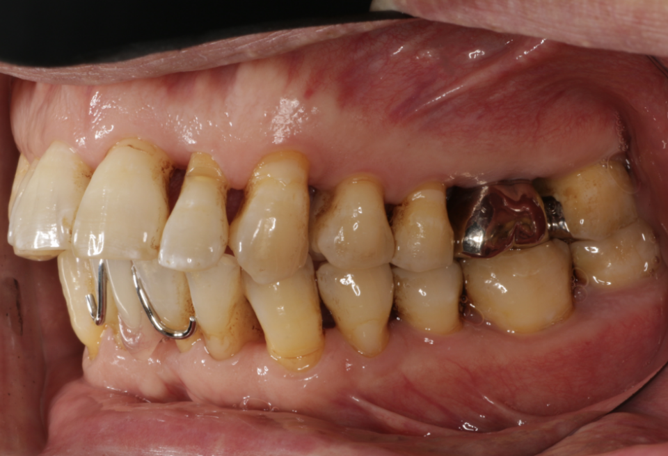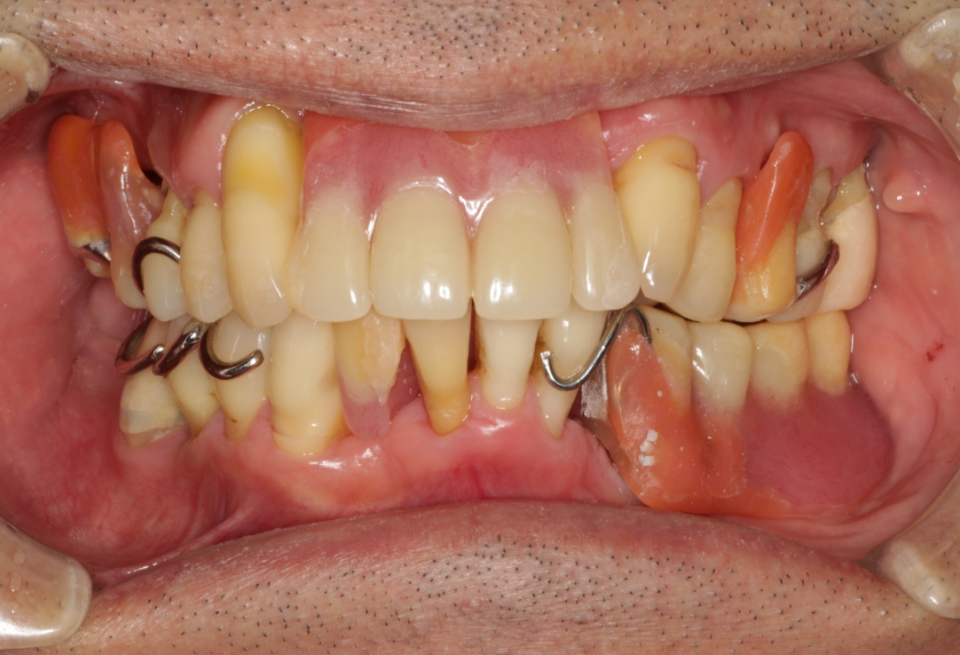 重度歯周炎、二次性咬合性外傷、う蝕(虫歯) 治療内容:歯周基本治療、歯周外科手術(歯肉剥離掻爬術)、根管治療、修復治療(コンポジットレジン)、補綴治療(メタルボンドクラウン、金属床義歯、治療用義歯)