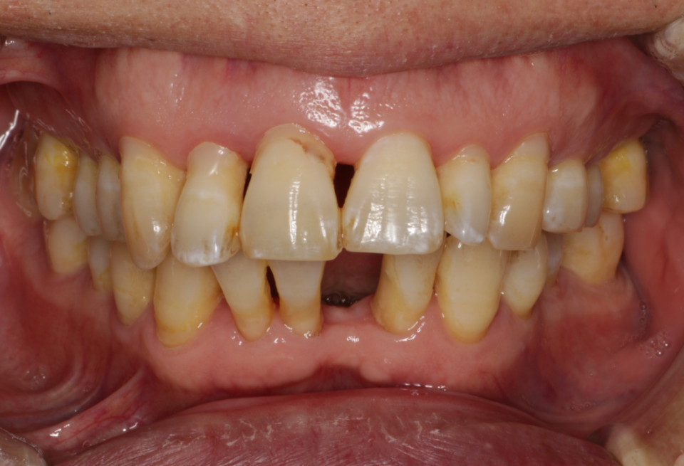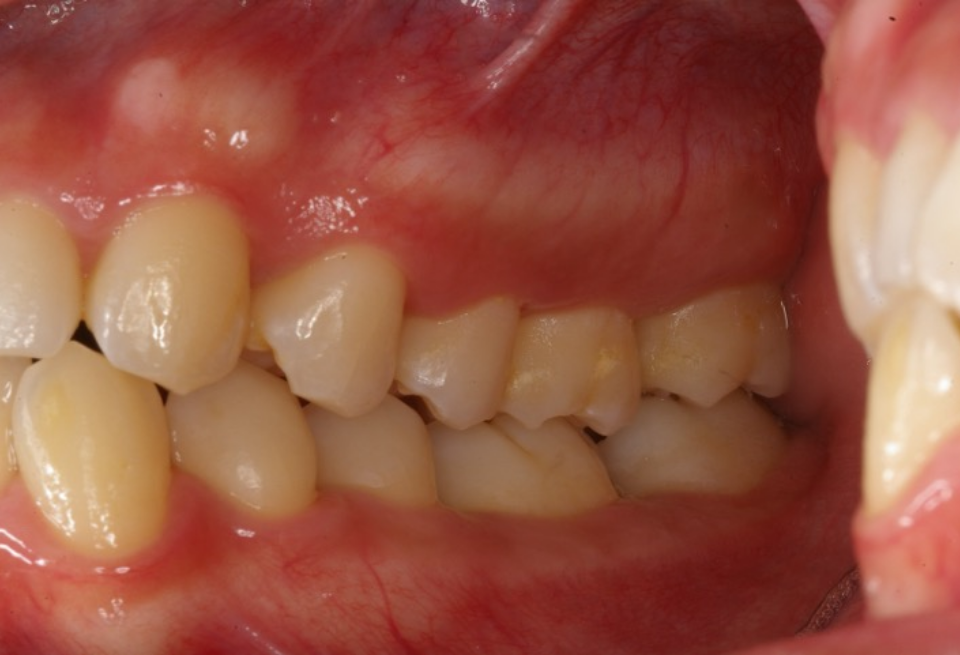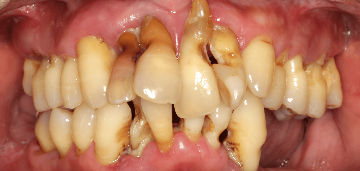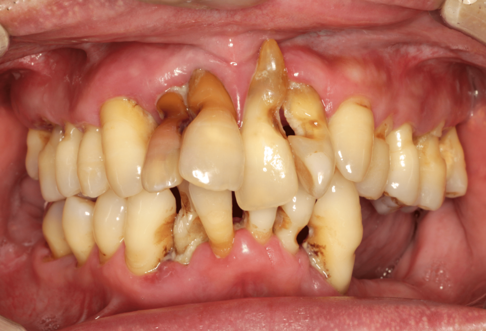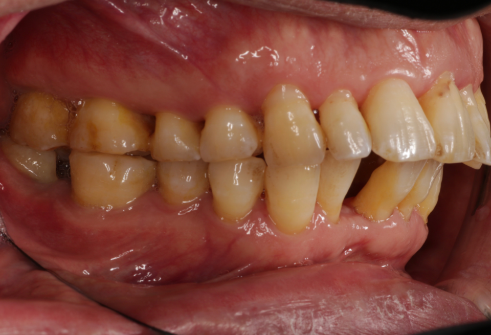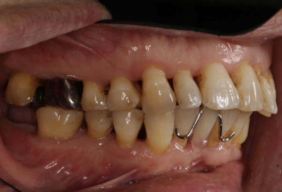 重度歯周炎、二次性咬合性外傷、う蝕(虫歯) 治療内容:歯周基本治療、歯周外科手術(歯肉剥離掻爬術)、根管治療、修復治療(コンポジットレジン)、補綴治療(メタルボンドクラウン、金属床義歯、治療用義歯)